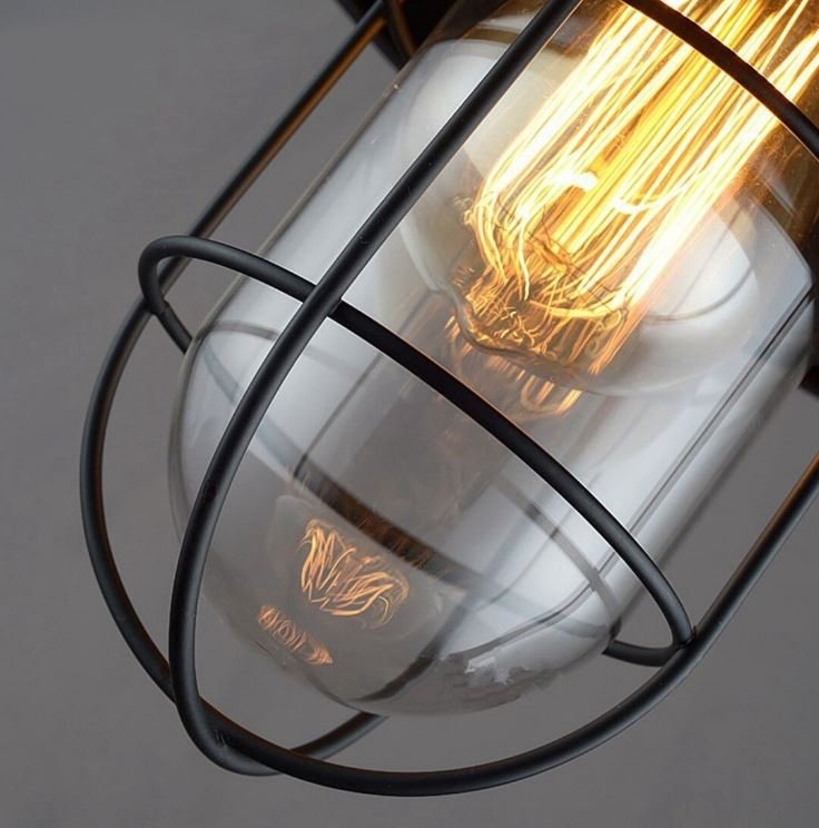 Stropní svítidlo v klasickém retro industriálním stylu s ochrannou mřížkou a ochranným sklem.